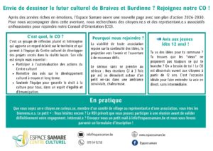 L’Espace Samare renouvelle son Conseil d’Orientation (CO) et recherche des citoyen·ne·s (dès 12 ans) et des représentant·e·s associatif·ve·s pour participer à l’évaluation de son action culturelle sur le territoire de Braives et Burdinne.
